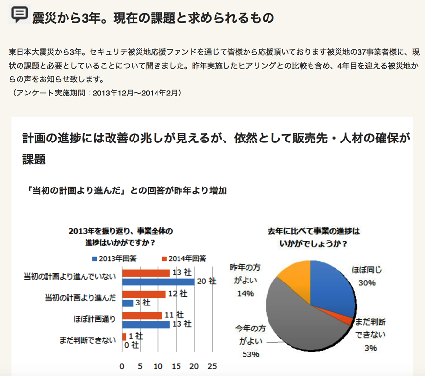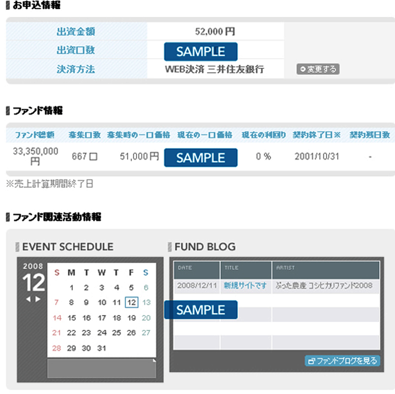 小額投資的投資者往往是商品的粉絲、認同事業理念,登錄為會員之後,就可以從網頁上自由選擇喜歡的事業進行投資,還可以在專屬頁面上了解自己的投資情況、基金情報、事業相關活動報告、商品的銷售情報報告等。即使沒有投資,也能夠在「securite」的購物頁面上自由購買商品,也能夠從各地方事業的近況報告了解當地的現況、掌握進度。