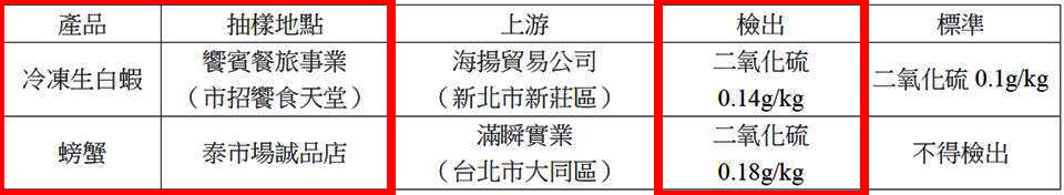其中,饗賓餐旅事業(市招饗食天堂)販賣的「冷凍生白蝦」檢出二氧化硫0.14g/kg殘留(標準0.1g/kg)。另外,泰市場誠品店販賣的「螃蟹」也檢出二氧化硫殘留0.18g/kg(標準不得檢出)。