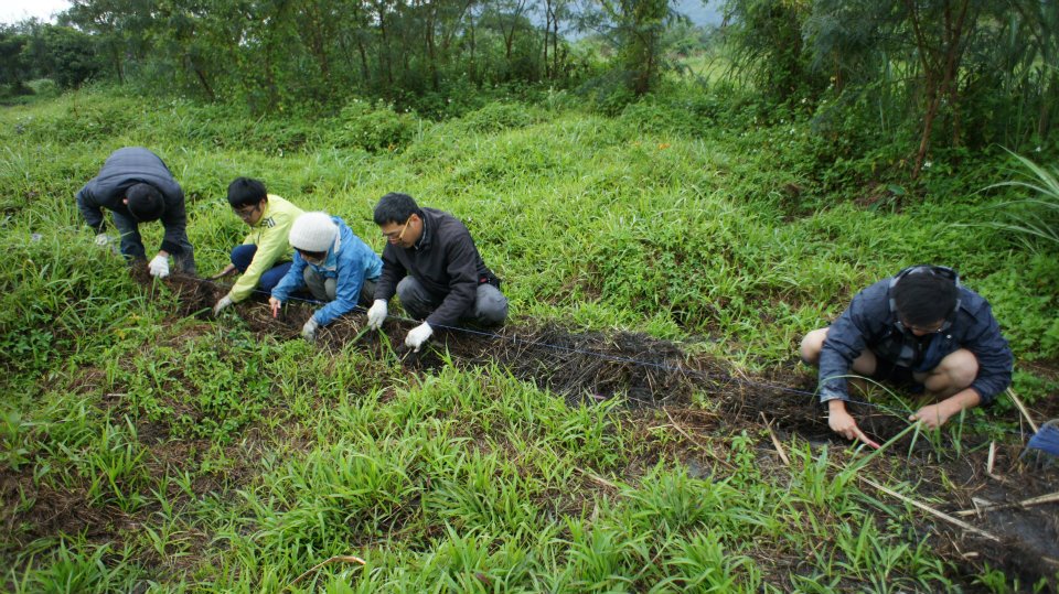首先拉線,接著要把厚厚的草葉腐質層割開,才能開始挖田埂的工作。