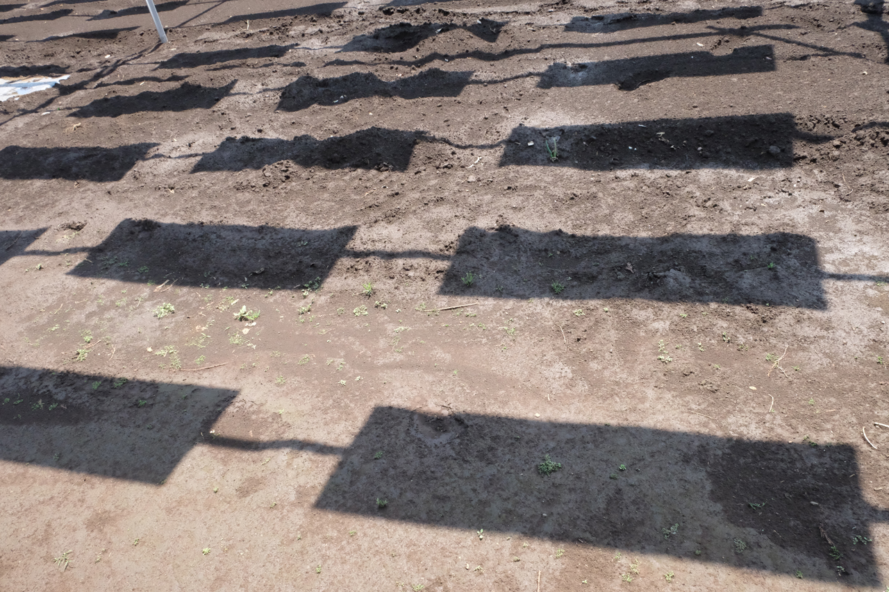 試種第二年的玉米,前半段鋪上可反射太陽的白色反射膜、要與後段比較差異