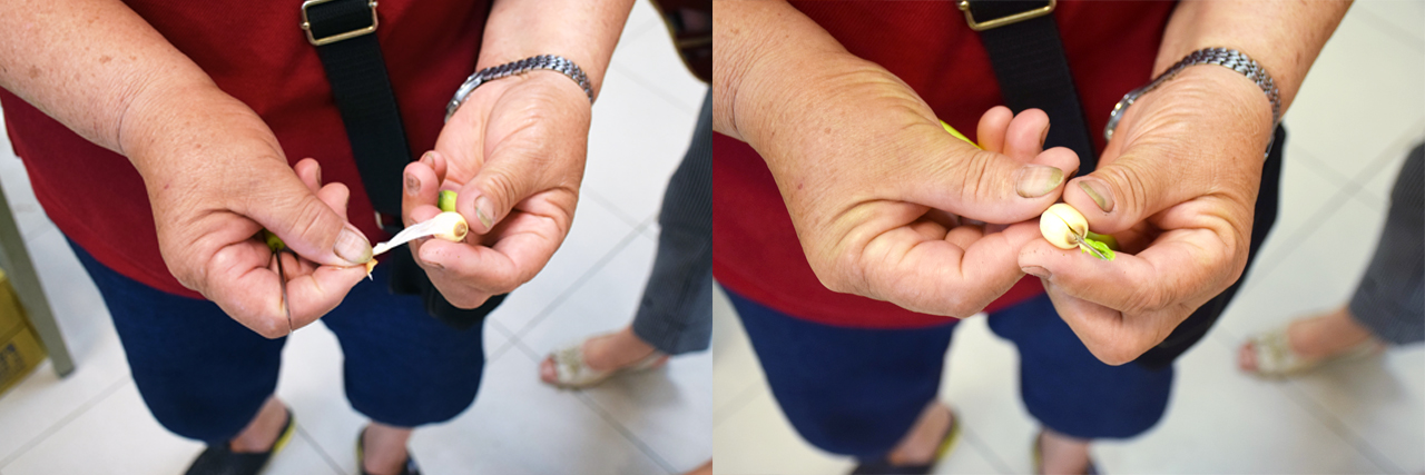 不過在觀摩黃文祿和學生團隊的實地操作後,當地近50位農民隨即熱切地討論起來,但多給予「還要再努力」的評價。蕭秋梅就說,「嘸概理想,」中間去殼、脫膜的過程還要用手撥,「乾脆自己用手挑比較快,」在她親自示範下,10幾粒的蓮子不到1分鐘就迅速撥完、去芯。