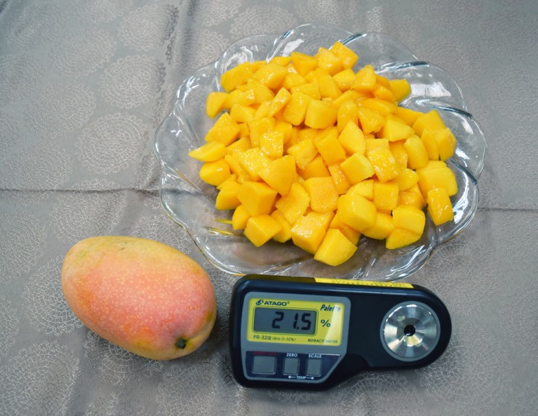 陳盟松說,愛文芒果甜度約11到15度,金煌則有19到20度;台中一號保有金煌的甜度和Q度,口感上有獨特香氣,「很像椰奶味道,」且纖維少,可以滿足不愛「吃絲」的消費者。另外,台中一號切丁後,也少有「出水」、「褐色」等劣化現象,加上果實成熟度約8成亦可採收、運輸,因此極具市場競爭力。