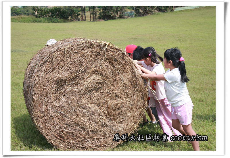 衝到牧草堆上又跳的、又爬的、又推的…連大人都加入陣容,