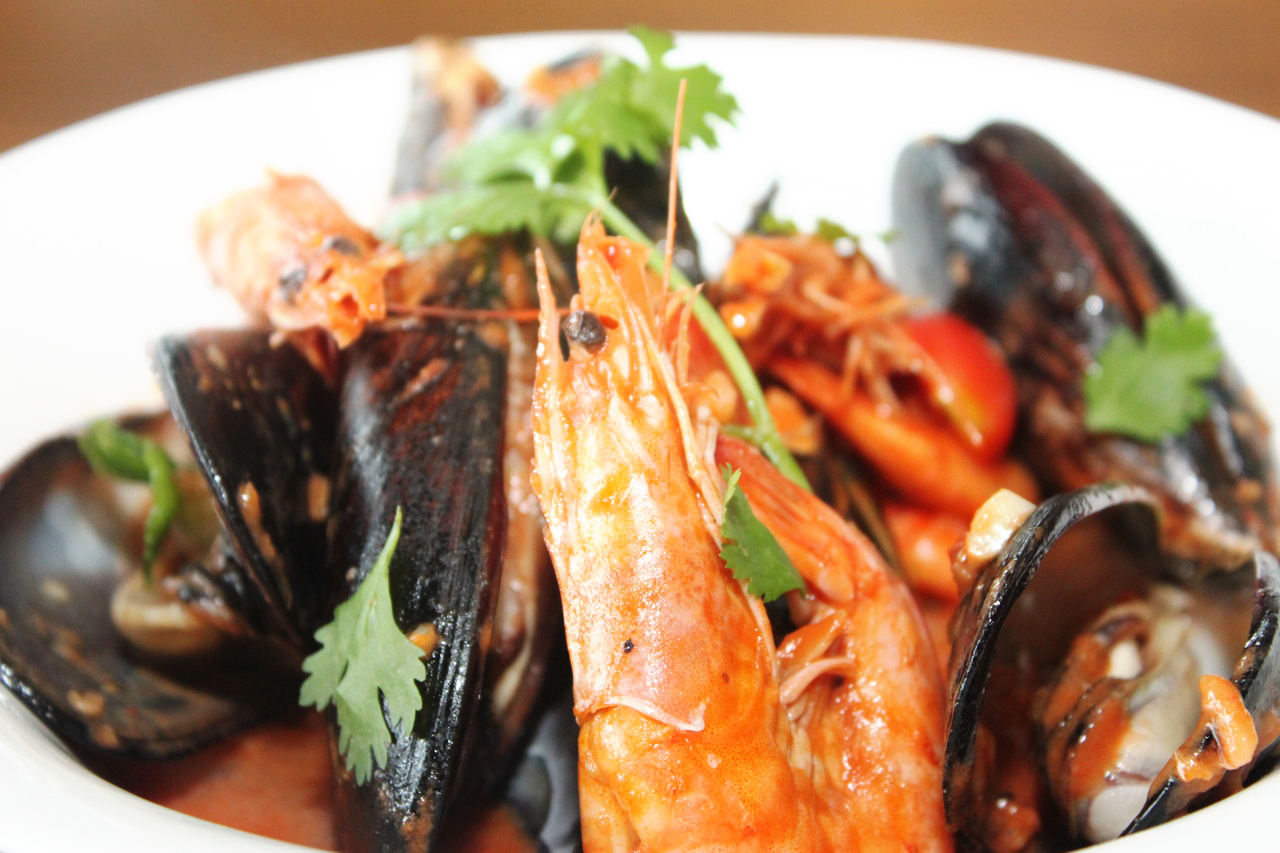 原料備好後,便先在炒鍋倒入油脂、炒香蒜末和洋蔥,再依序置入番茄丁、鮮蝦和馬祖淡菜,炒熟期間可加入少許鹽、糖、黑胡椒調味,並加入椰奶和5大匙的水讓蝦、貝可以均勻受熱;另外也可稍加鍋蓋,讓貝類確實煮熟。