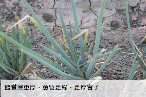 我問阿洪,為什麼田區四個角落的蔥是相對健康與漂亮的?為什麼田區部分區域的蔥特別差,特別令人擔心?