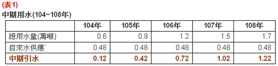 中科四期二林園區調整產業方向後,預計未來長期用水從16萬噸降到2萬噸,但水利署從109年才能正常供應,於是從104年到108年的中期用水,國科會就要自己想辦法(表1)。到108年需用水1.7萬噸,0.48萬噸由自來水取用,另外的1.22萬噸水(最高取水量)從何而來,原計畫是從莿仔埤圳水源頭引水。