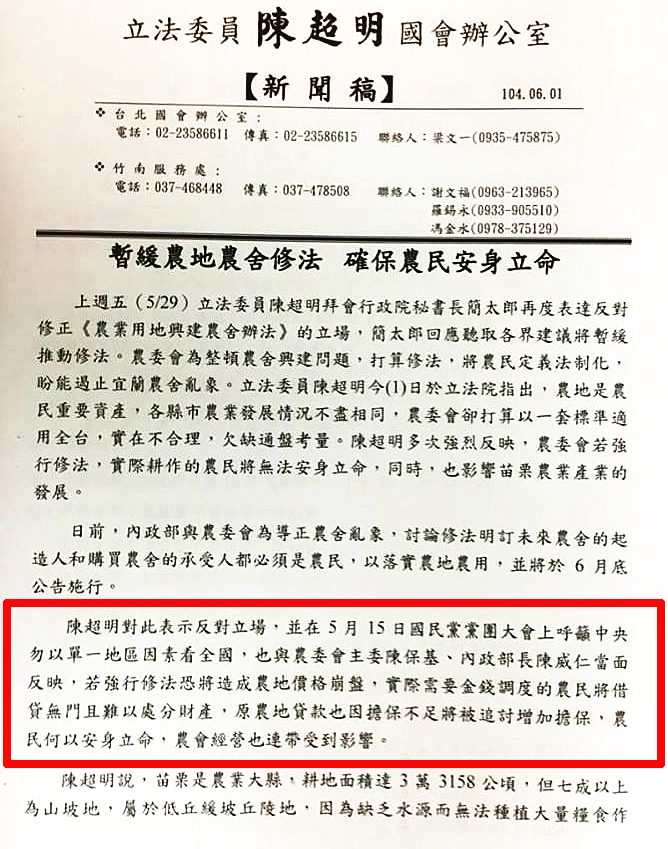 9月底,台聯黨團和國民黨等18位立委更在院會連署,將「農業用地興建農舍辦法」從備查改到審查,想通過必須經過立委表決。