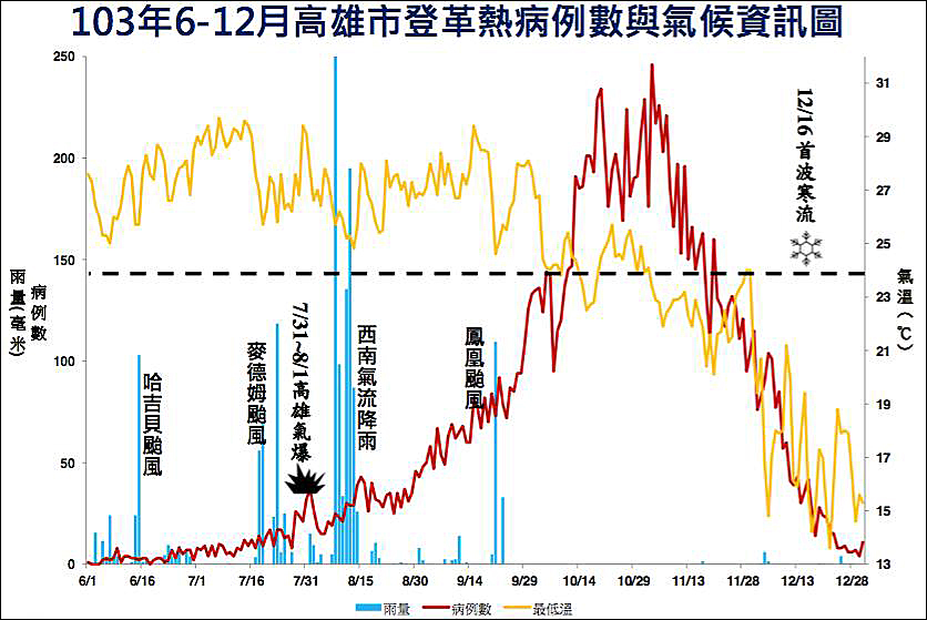 環保署「登革熱資料統計分析小組」比對1998年到2014年的登革熱及天氣資料,發現夏天颱風、大雨後,登革熱病例有明顯上升趨勢,例如去年7月麥德姆和9月鳳凰颱風來襲,降下大雨,10月新增病例達到高峰,每日破150例,不過11月初溫度降到24度以下,病例數隨之下降。