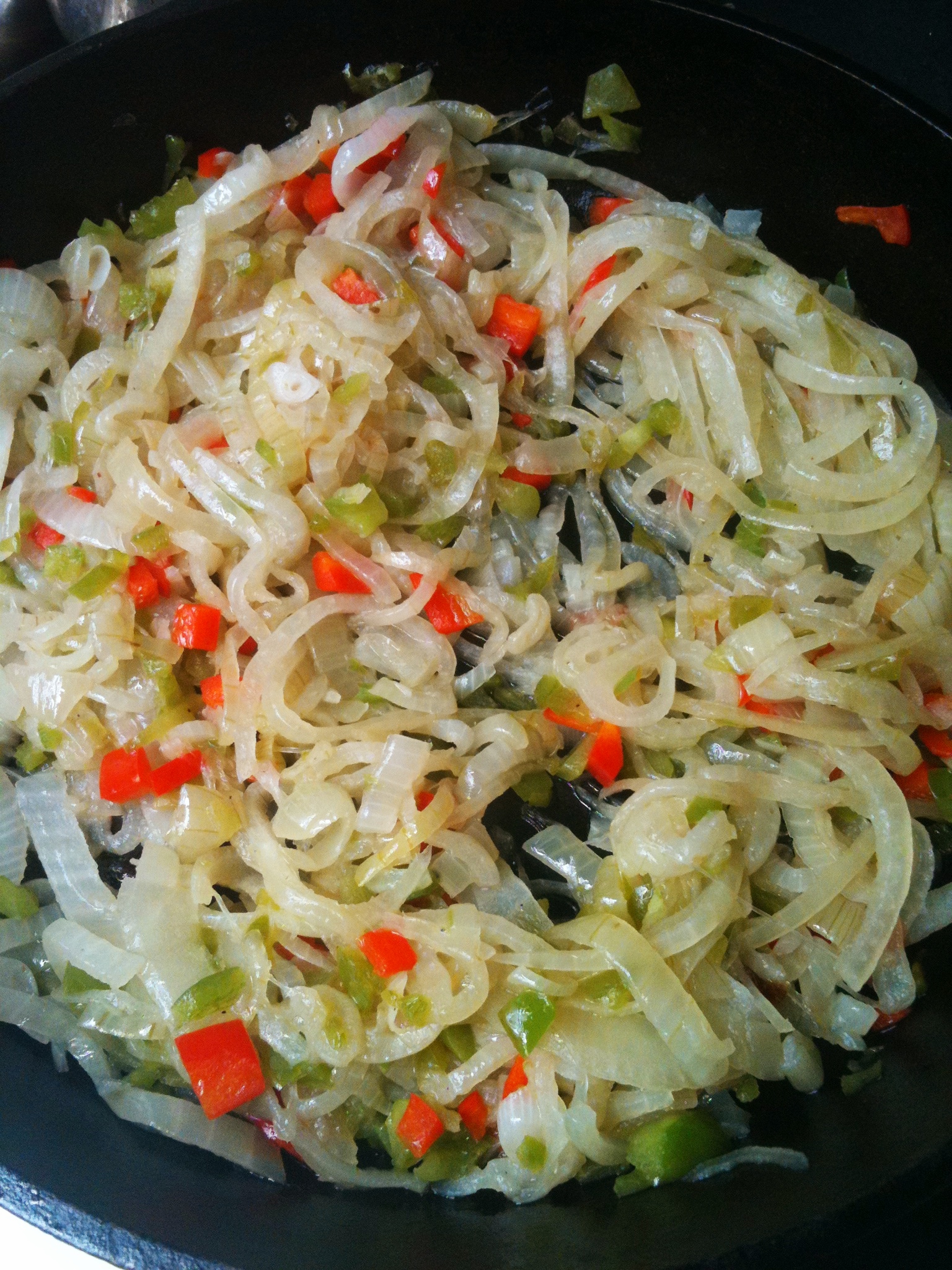 3. 將紅椒青椒丁及金黃馬鈴薯加入平底鍋中與洋蔥一同拌炒 鹽巴調味