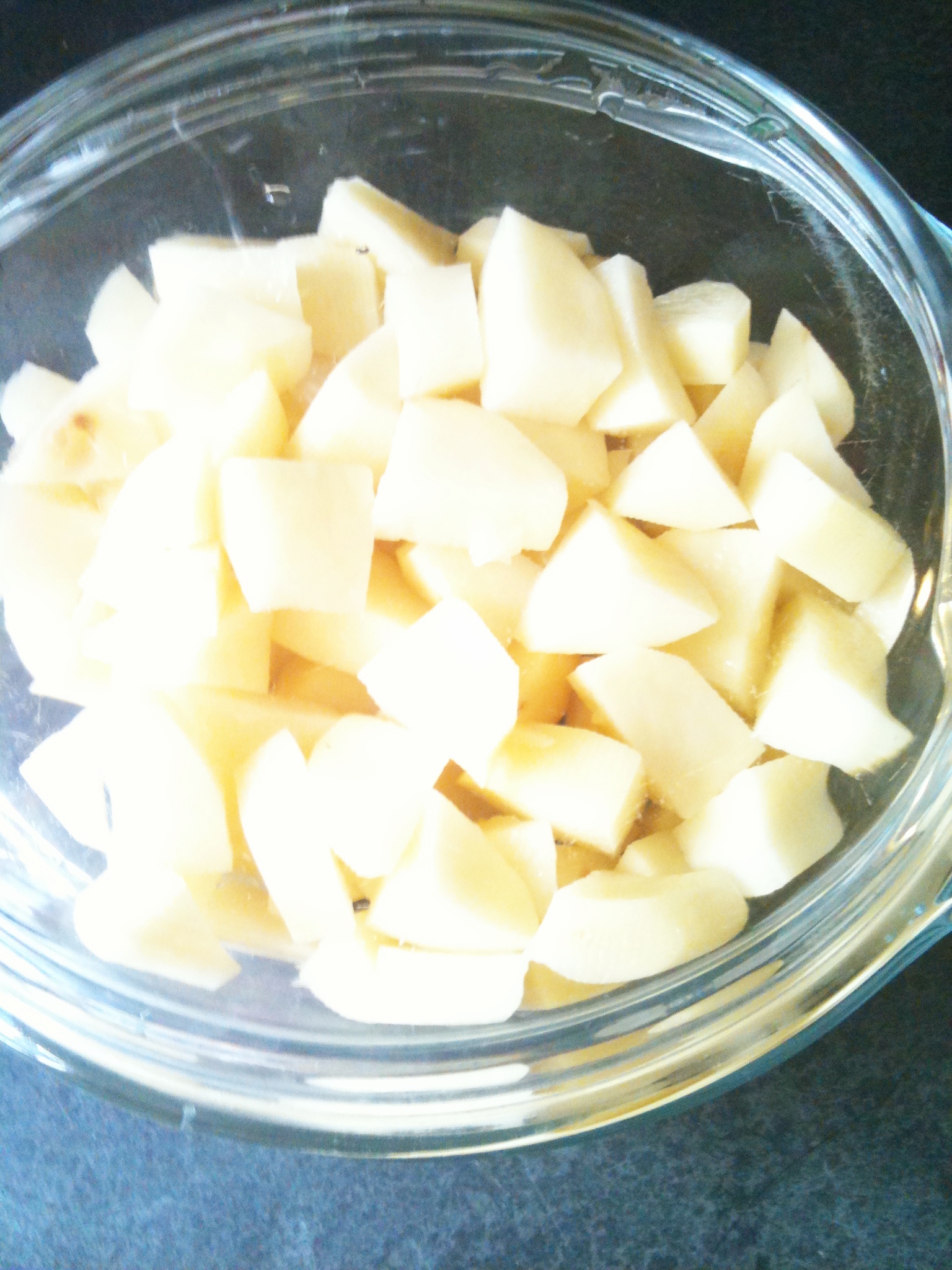 2. 將切塊馬鈴薯置於加蓋容器中,用微波爐中火熱約10-15分鐘,再煎至表面金黃