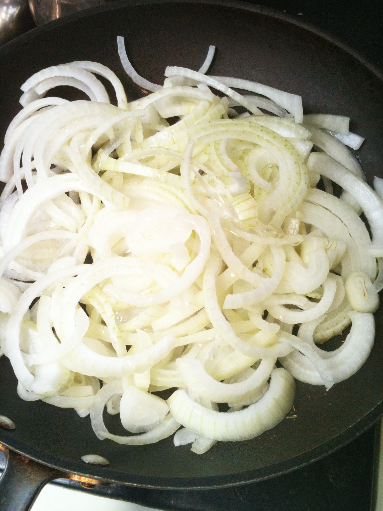 1. 平底鍋加入大量橄欖油溫熱後放如洋蔥絲 轉小火 拌炒20-30分鐘 至洋蔥軟化微黃 這時候洋蔥的辛辣已經轉變成甘甜囉!