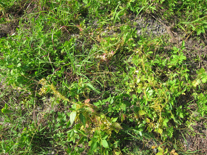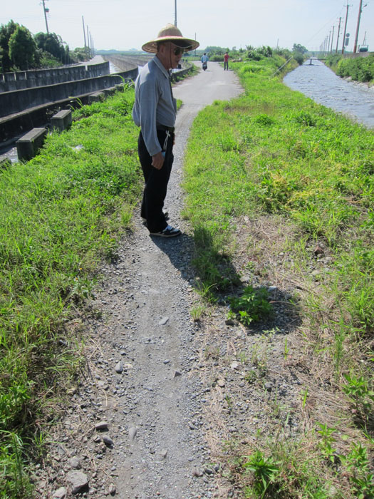 上圖阿伯所站立的位置即是政府打算埋設約24公里輸水管至中科四期二林園區的圳頭處,阿伯視線往右觀察的是一片黃色細條狀有如蜘蛛網的『平原菟絲子』,這是一種不具專一性的寄生植物,一旦它找到宿主,就會纏繞宿主的莖,吸乾其養分與水份,而至宿主枯萎死亡。