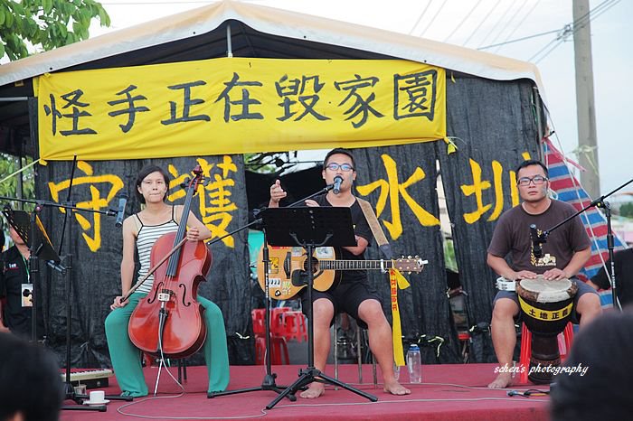 下午四點,水圳巡禮來到溪州音樂會會場,歌手及獨立團體都輪番以音樂為守護水圳發聲,一旁的阿伯、歐巴桑也跟著社區的婦女小孩打拍起舞,許多藝文界人士力挺,其中台灣文學作家楊翠表示,這不只是溪州農民的事,而是全台灣人民必須共同面對的問題,我們今日最主要的訴求是農民的生存權及守護最素樸的生命價值。最後天色漸暗時,吳晟老師上台了,他說我們今天是為正義與倫理而來,呼籲大家必須堅持到底直到行政院有正式的文件承諾,最後還多次鞠躬感謝遠道而來的朋友情義相挺。