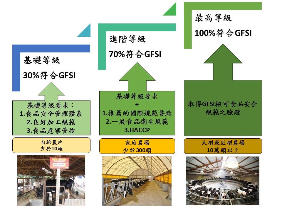 這樣三階段的食品安全架構對應到不同規模的生產者,對於10頭牲口以下的自給農戶,達能要求其需符合基礎等級;再者,300頭牲口以下的家庭農戶必須符合進階等級;至於擁有10萬頭牲口以上的大型和巨型農場,則必須完全符合GFSI食品安全規範,同時取得GFSI符合性規範的驗證。小、中型農戶只是生產規模較小、投資金額較少、基礎設施相對陽春,不代表他們不需要對食品安全做出承諾與努力。