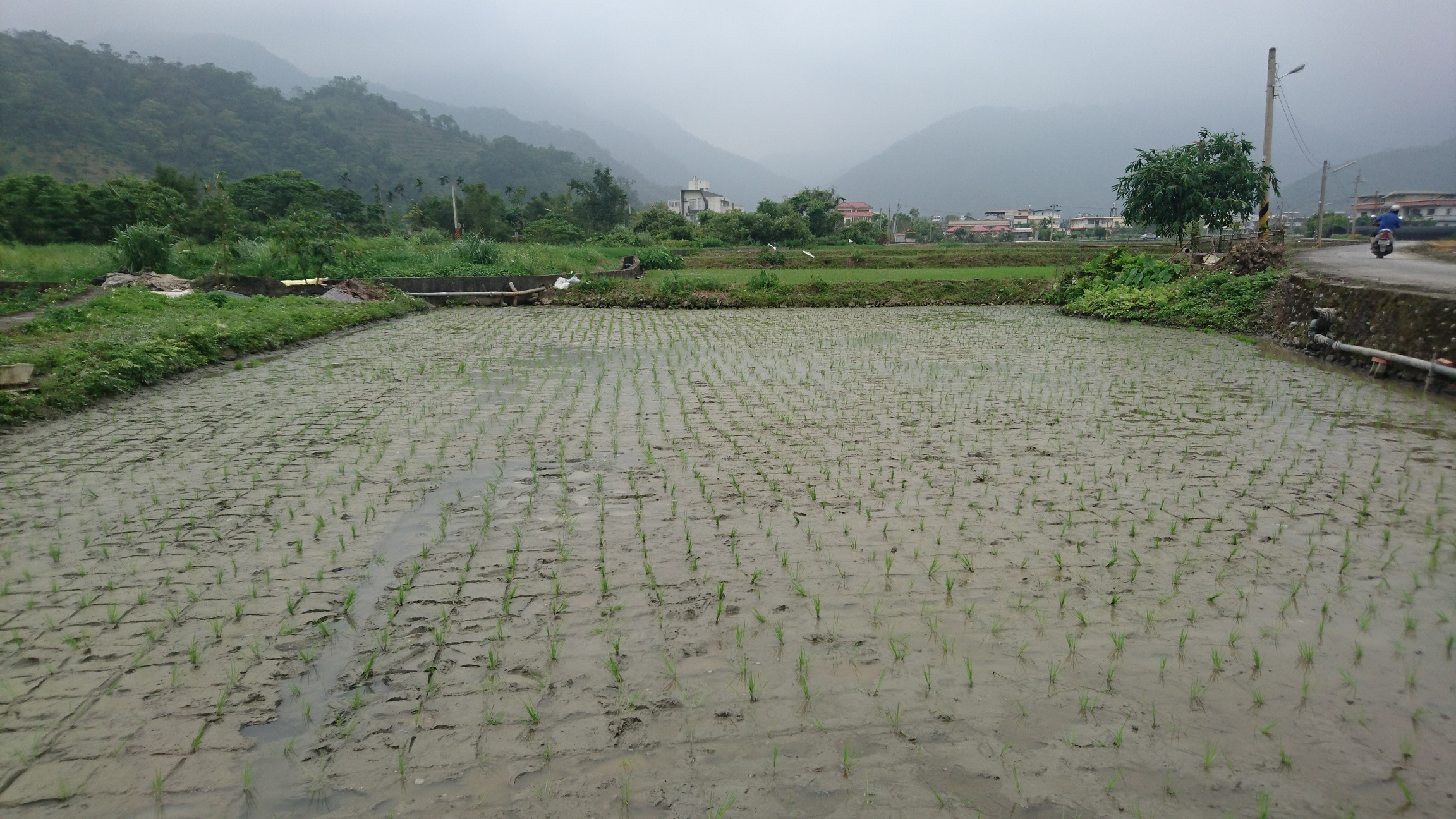 ▲圖為2016年紫米手插秧甫完成。 爺爺分家後,父親分得2.7分佃地,且是被馬路和水圳隔成三塊的不完整佃地;這塊居中的部分才約5厘地大的田地,在50年前牛耕的年代竟分成了5小塊,約30年前機械進步才化零為整成如今的一塊地。