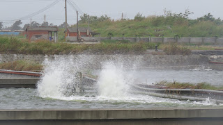 既莫蘭蒂、馬勒卡後,大偵探一點也不敢大意,因此在9/28梅姬颱風登陸前,又緊急搶收了一次蝦,想不到蝦蝦們竟然在短短二周,從平均42尾斤躍升至36尾斤大小(這樣的進展是該感謝一下颱風嗎?!….)。接連三日的收成將蝦子的密度降低了,所以當颱風肆虐帶來大雨及魚塭區長達36小時的停電時,並沒有導致重大的傷亡。
