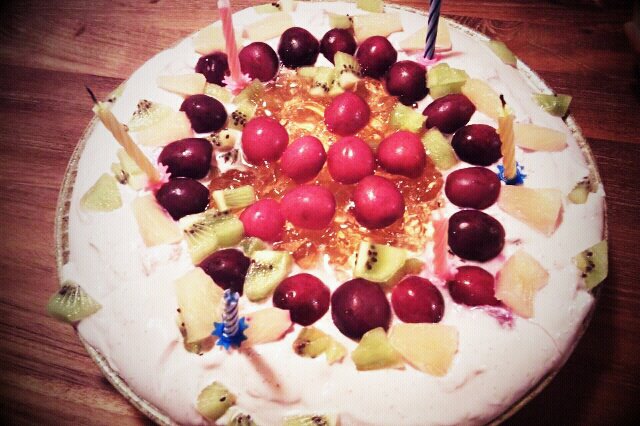 因為是6月,所以我選了美國的櫻桃來代替草莓。美國櫻桃的甜酸味非常適合清爽的果凍。還有,奇異果,以及鳳梨(是罐頭的)也有。我用盡了我所有的設計能力,好像在白紙上用蠟筆畫畫似的,在粉白色的果凍上搭配了深紅色,淡綠色,淡黃色的水果片。——好了大功告成,最後的步驟是最重要的任務,就是在那個軟到不行的土地上要擺五顏六色的小蠟燭,我先讓自己深呼吸,再拿起蠟燭,小心翼翼地,慢慢地,把它擺進軟軟的果凍上。蠟燭,隨著果凍的搖動,晃了一下,我給它一聲加油,請不要倒,——這樣一根一根地去擺,總算完成了!其實,這個生日果凍最難度的步驟應該是擺蠟燭這個過程吧!