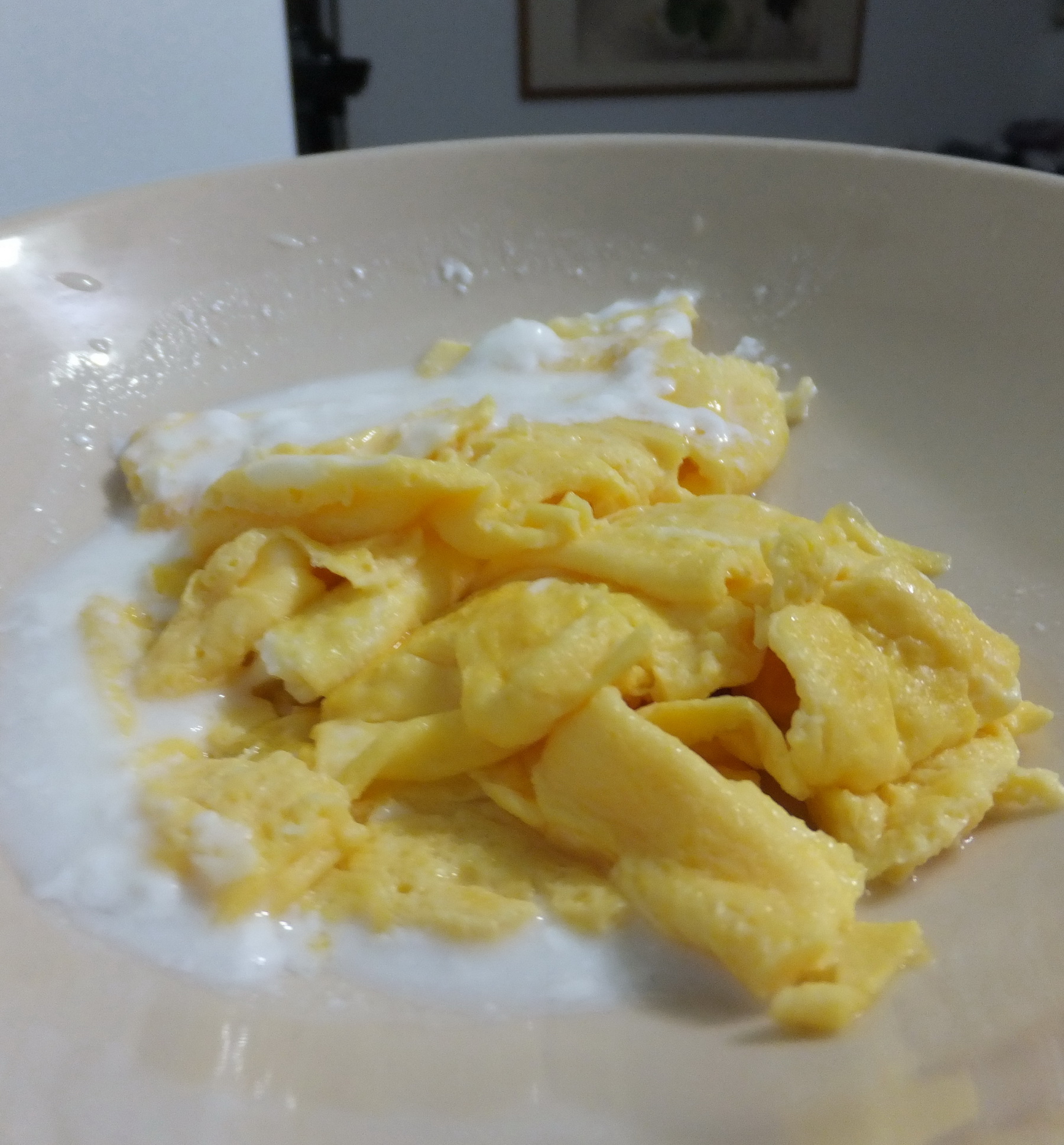 逛生活市集和德式麵包店時,看著各種口味的手工優格醬流口水,想起每週宅配的天然優酪乳,直接食用口感帶酸,而且狀似塊狀,似乎也能當作優格醬? 深夜只想簡單煮,今夜決定嘗試:以嫩蛋為主角,天然優格為沾醬! 步驟1. 雞蛋兩顆,加入少許水和鹽巴,拌勻。 步驟2. 以平底鍋或不沾鍋少油,把蛋煎得黃嫩、黃嫩。 步驟3. 淋上新鮮優格。 實驗心得: 熱呼呼的香嫩炒蛋配上冰涼優格天然的酸,是種絕妙的搭配! 成品: 如果喜歡這個小點子,歡迎登入點選”鼓勵作者持續寫作”,謝謝大家呦! 寶珠 : )