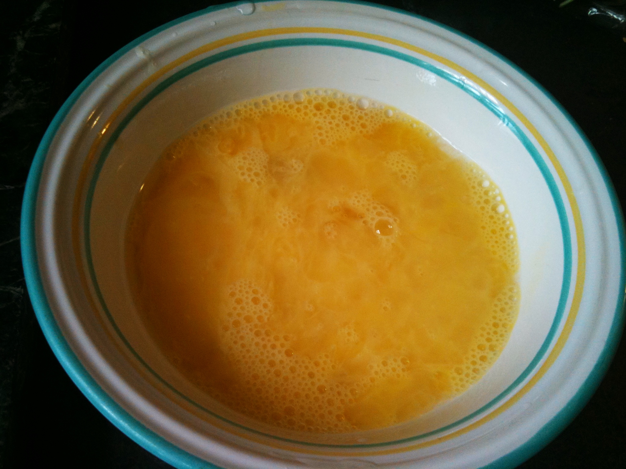 2. 主廚的秘密來了~ 將兩顆雞蛋均勻打散(不要過度打出泡沫喔!) ,加入兩大匙牛奶,