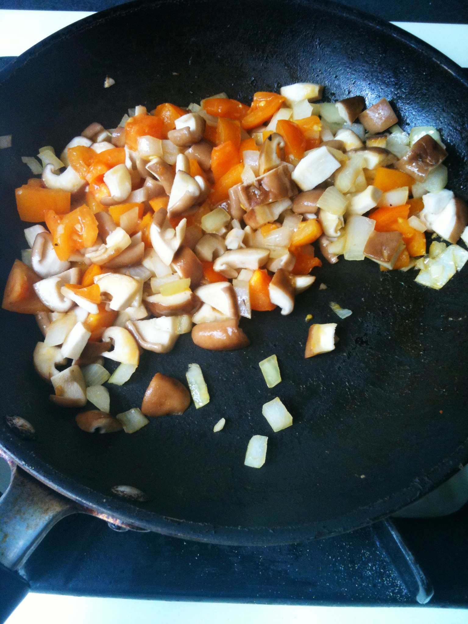 1. 將所有配料切成一公分左右小丁,平底鍋內加入一小匙油將配料炒軟,起鍋備用