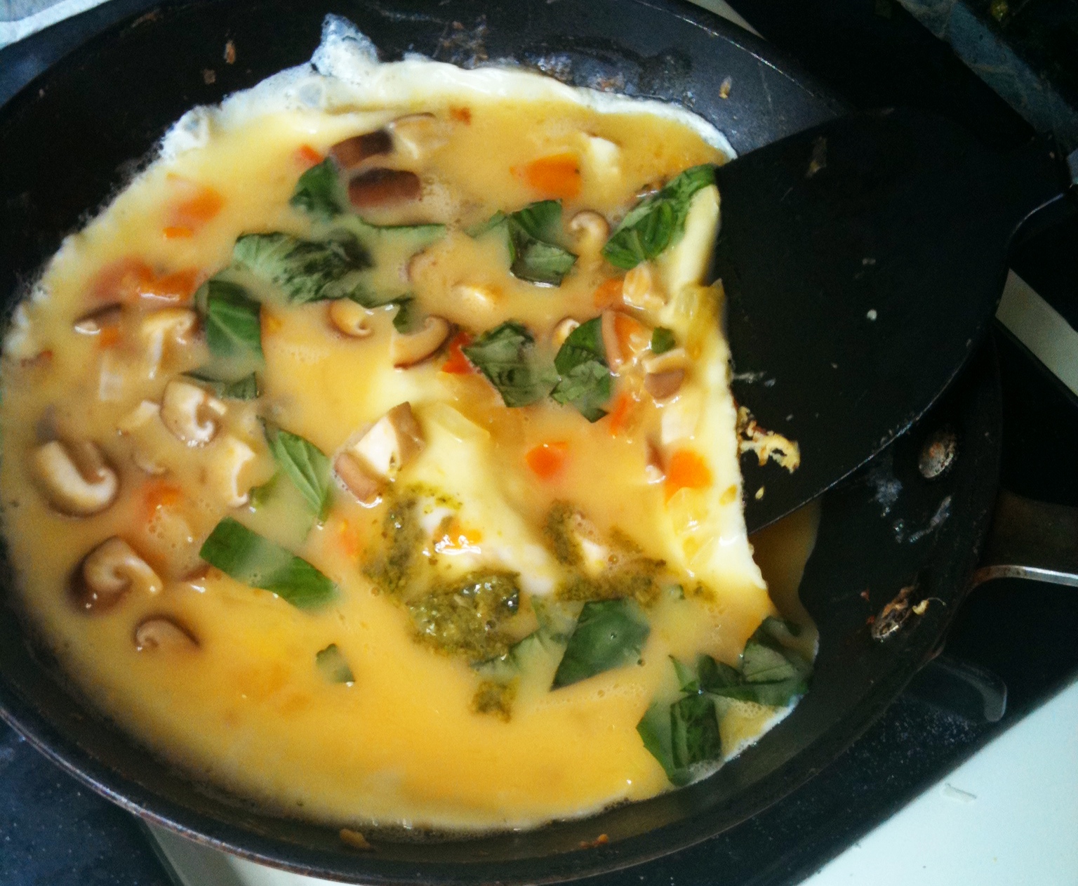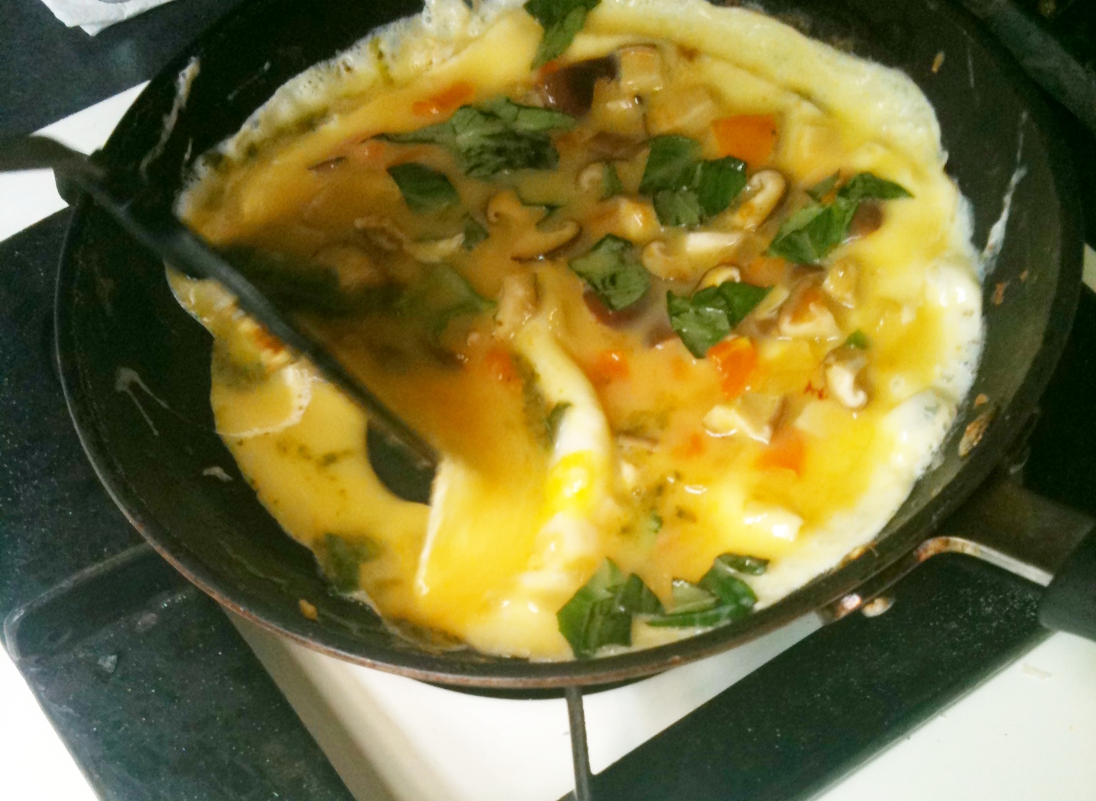 等底層蛋汁稍微凝結,用鍋鏟將一邊底層微微翻起,然後傾斜鍋子讓中間的蛋汁流到鍋邊, 再換一邊重複這樣的動作,直到中心沒有液態的蛋汁,這個動作可以幫助蛋捲均勻受熱