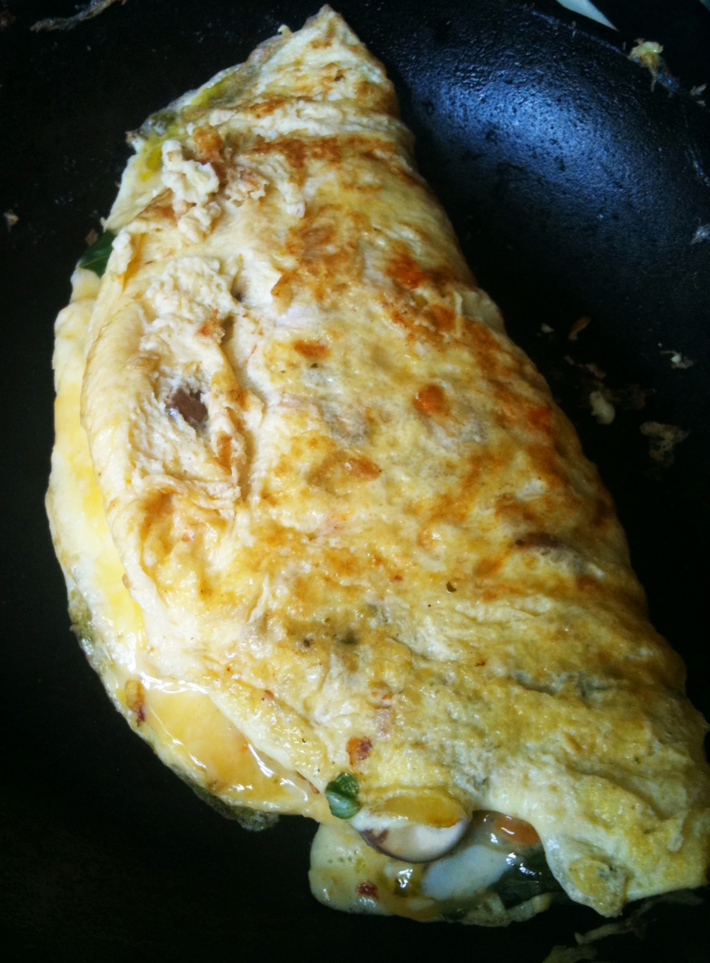 5. 轉小火,在蛋捲上鋪上起司絲,確認蛋捲凝固成型後,對折成半圓