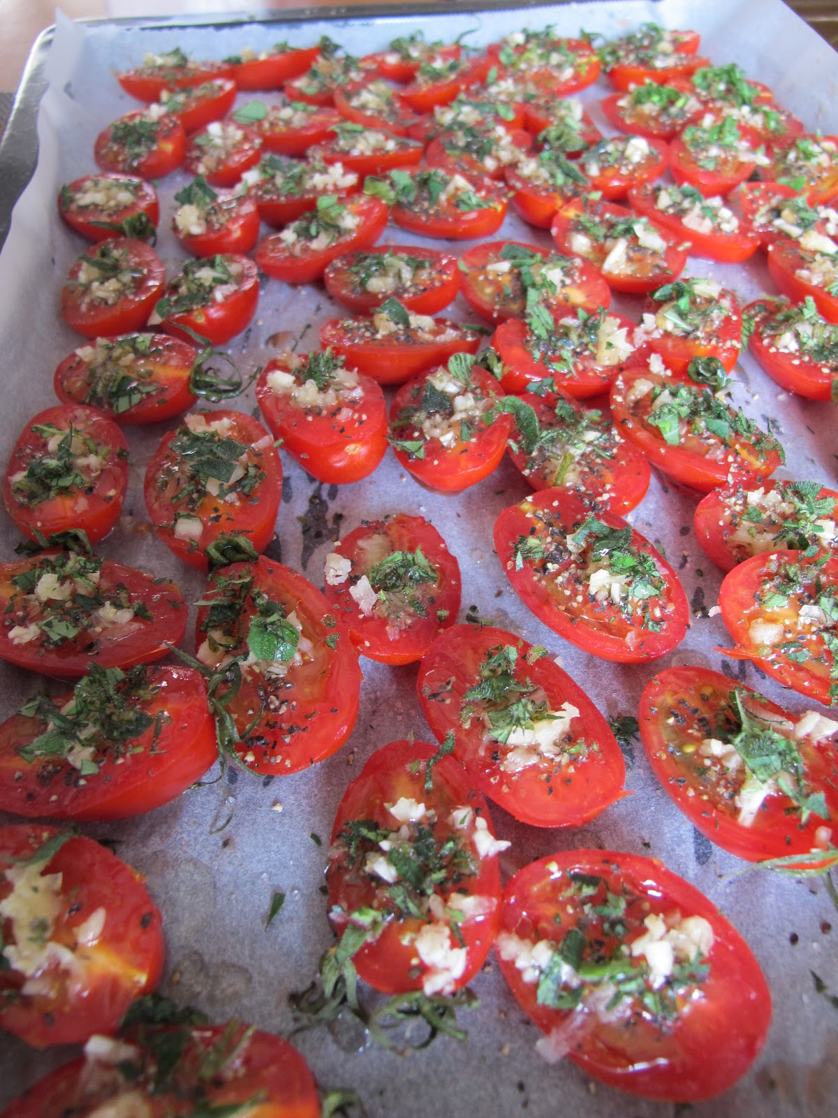 -每個蕃茄表面撒上海鹽,研磨胡椒粉,糖.蒜頭切成碎末撒上,奧勒岡也相同切碎放置餘蕃茄上面, 最後,用橄欖油淋上.