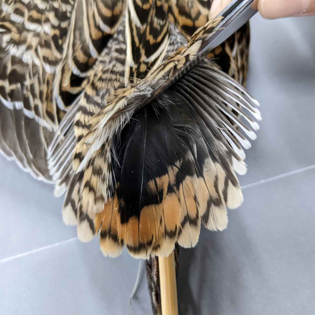 最新的研究利用電子顯微鏡掃描了這根黑白鑲嵌的「發聲羽」,發現這根羽毛除了在顏色(其它尾羽皆有帶橘紅色)及造型(最外側尾羽極不對稱且羽軸根部彎曲)上特異於其它尾羽之外,在羽毛細部的羽小枝構造上也有獨特之處──這根羽毛除了橫斑之外,大致可從平行羽軸的方向分出淺色與深色兩個區域,而羽毛發聲主要是由淺色區的震動造成,這個區域的羽小枝缺少了一般飛行羽(翼羽和尾羽)都會有的倒鉤構造,使羽片更有利於震動。