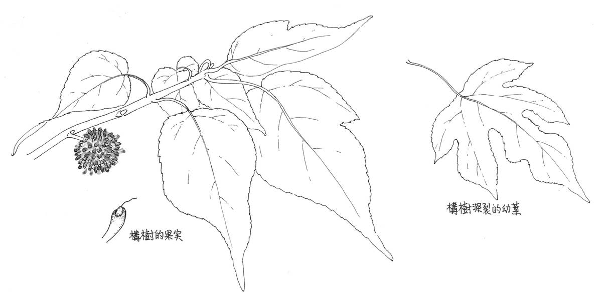 小葉桑的幼葉深裂,和成樹完整的心型葉有天壤之別,常讓對它們不熟悉的人們誤以為是兩種植物,構樹也有同樣的現象,當它們褪去幼葉,長出大方的成葉,也就是它們開始開花結果的時候了。冬天小葉桑跟著其他果樹一起落葉,落葉後的枝條出人意表的整齊漂亮,在空曠處生長的桑樹,一根筆直的主幹一年抽長了四公尺,向兩旁分出整齊的側枝,擎天而舉,像一支巨大的魚骨(只是側枝互生並非對稱)。隔年春天,桑葉沃若,每一片新葉的葉腋都懸起一串小小的淡綠色花序。「柔荑」是這種單性花序的名字,從《詩經》中來,古典而優雅。招蜂引蝶,不必鮮紅橙黃,自有一種內斂的妖嬈,暗中轉花為果。這種野生的小桑椹滋味誘人,不是肥美的大桑椹可以相比,我總等不及果實由紅轉黑就要去摘,而它的嫩葉也是好吃的野菜,它們在我園中已堂堂登上作物名錄。