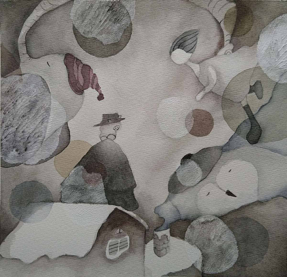 水從藍綠色玻璃瓶細長的脖子裡傾瀉,雙手用力緊抱。颯颯而至的風飛舞,拍下枝頭縫隙裡附著孤獨的枯腐的葉,忽地風岔出氣。唯獨水緩慢地流入白千層衣著襤褸下的草皮圈。一汩一汩緩緩釋出。陣風鑽入大大小小的林木與建築間,化成小小氣流。清風所及,葉落飄飄。日頭落下,天空仍掛著幾抹白雲。