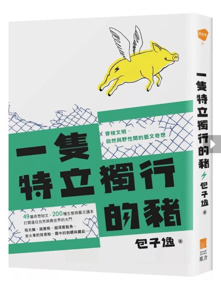 B)「我經常認為藝文創作其中一項閒散的功能,在於讓人順著生活的紋路「看見」一些平常不以為意的東西,於理所當然的安適表象上撢灰。人類的想像力往往比自己以為的更貧瘠;窗明几淨的時候少,蒙灰的時候多。有的時候我們看不見,也許不是因為自我中心、心懷偏見或什麼歪瓜裂棗的根本性悲劇,實在是因為沒有那個契機⋯⋯」散文寫作是包子逸觀看世界後,咀嚼反芻後的產物,她是找樂子的能手,幽默是她實踐共存哲學的方式。《一隻特立獨行的豬》全書洋溢包式可愛的奇想。如包子逸說的:「生活得越平板,看見未知處的機會就會被壓縮得越厲害,而適時的一根雞毛撢、一根手指、一本書或一位有趣的朋友,就是讓生活立體化的支架。」本集邀請包子逸談其觀看世界的眼睛與心思。