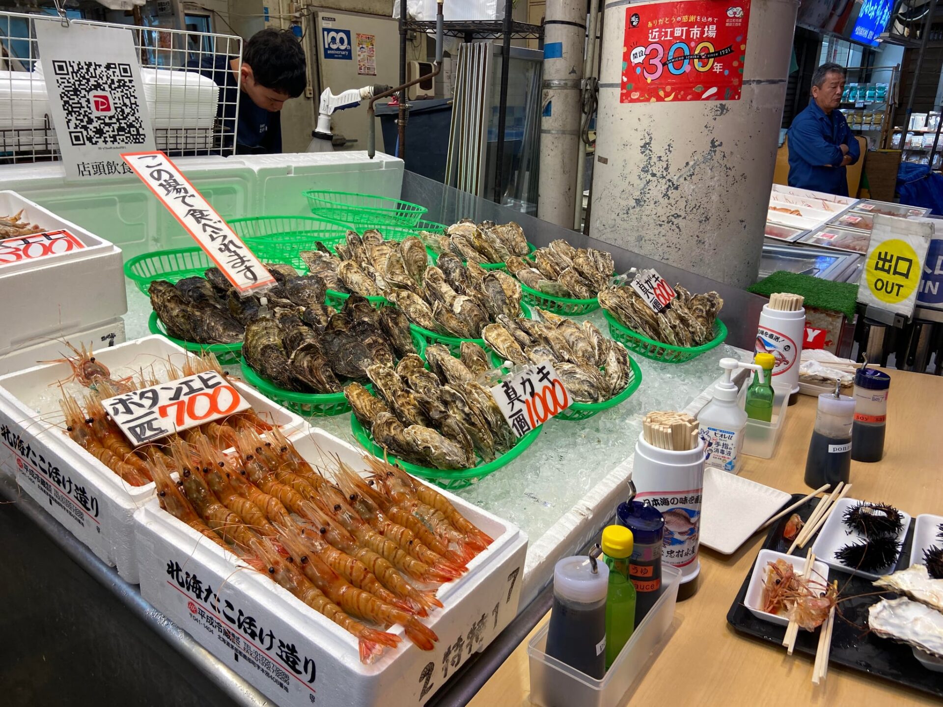 那天,吃罷烤河豚與烤烏賊串燒後,冒著煙的胃急需一些水汪汪吃食。市場入口右側的《塰坩》有各式加賀料理,包括黑輪。不惜排隊,點了車麩、蘿蔔、蒟蒻、白肉魚丸、竹輪、蝦球、烤豆腐等品項,並意外發現,店家提早以北海道來的香箱蟹,製作了誘人螃蟹面。