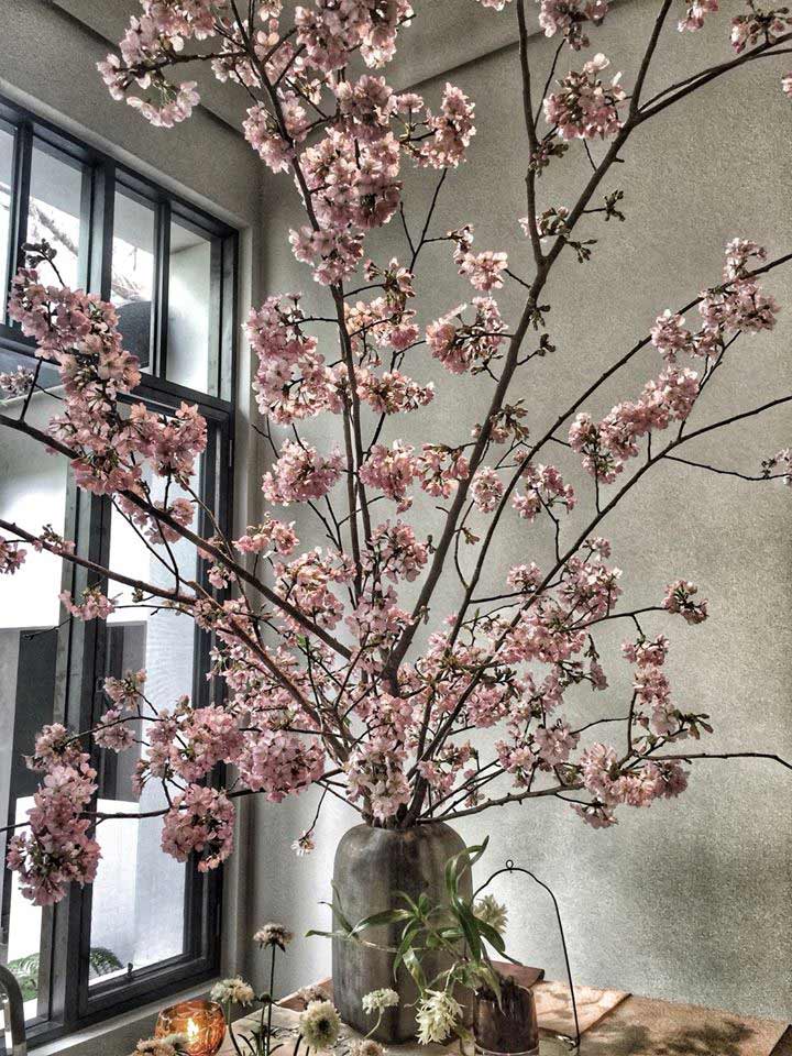 此桌以昭和櫻為主視覺,近桃紅色陸蓮對角呼應,多寶格裡的墨綠袖珍菖蒲,幽於一隅,居中之鐵線蕨與苔蘚,間或三兩枝草,樹蘭、石斛蘭。