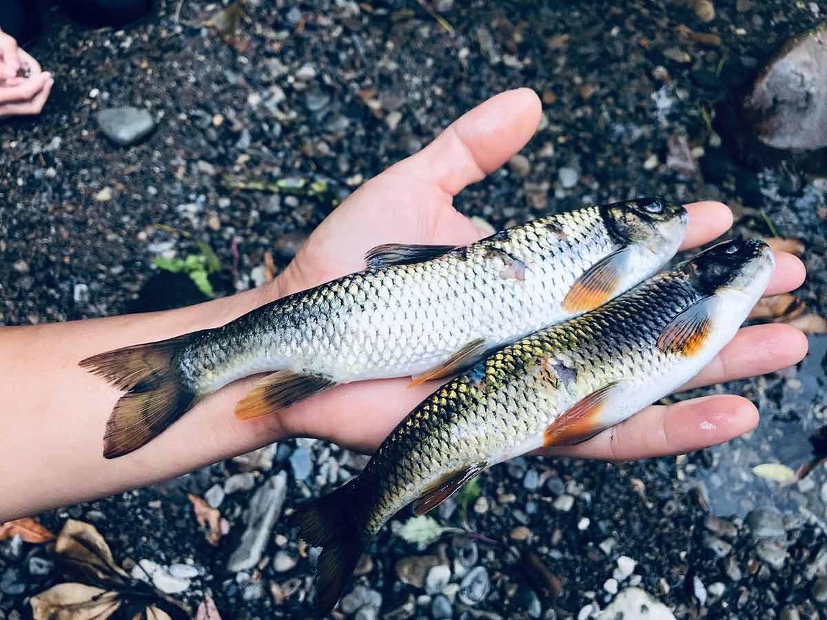 我於是請他們抽出自己的一把小刀,準備進行魚身內臟的處理。孩子們的手中,或是抓握苦花魚、或是石賓。我看見他們將一把小刀劃下,許多驚叫聲又起,他們直剌剌的看向裂口中滑溜出的腸子群,口裡一邊嚷嚷著噁心、卻又仔細的觀察起這些內臟器官;也有孩子乾脆扔下刀子,決定不吃魚,「我不喜歡這樣,好殘忍。」