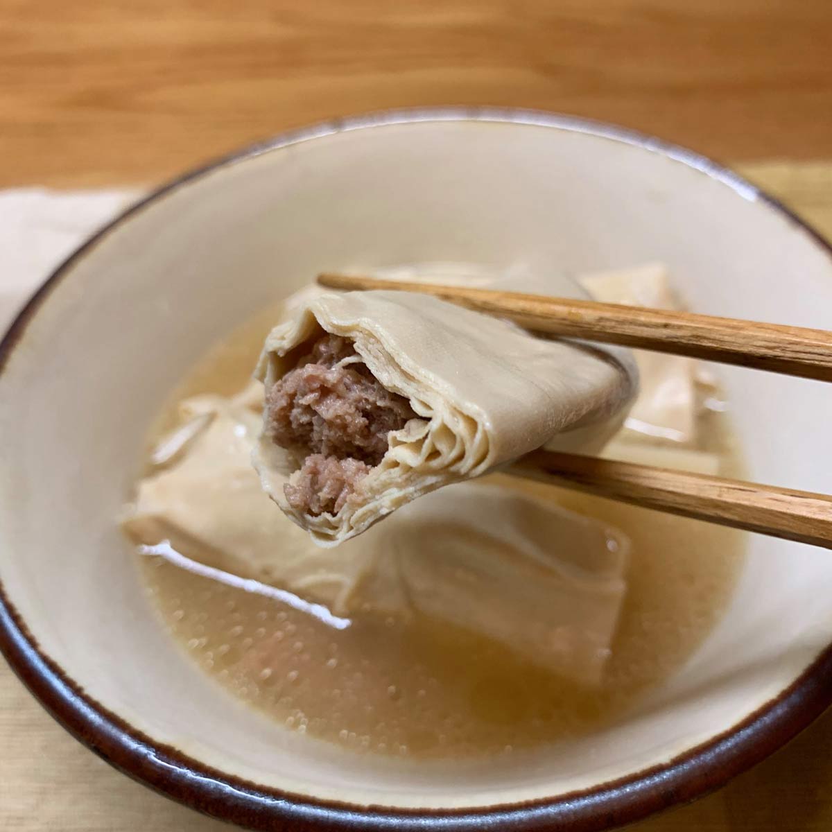 百頁包肉是一道傳統老菜,用冬筍和金華火腿熬高湯,百頁用小蘇打粉泡發需要經驗,泡太久會破,不夠久又咬不動。泡發後用清水洗淨,包入由醬油及麻油提味的豬絞肉,十來捲就用綿繩紮成一綑,像鞭炮一樣,放進高湯裡煮不會散開,但炸得一屋子鹹香。馬世芳說,百頁包肉雖是圍爐年菜,但上百捲根本吃不完,圍爐後還可以外帶,當成春節期間的早餐。