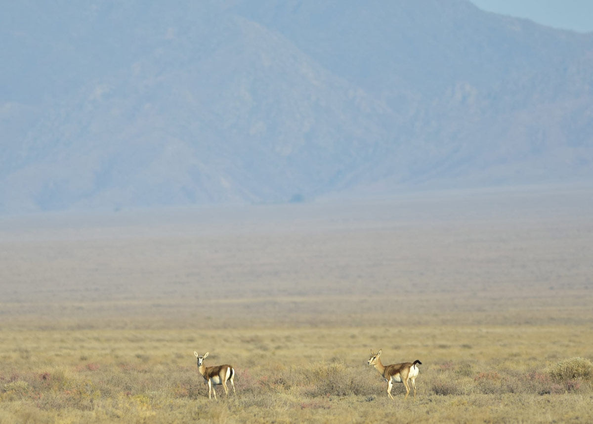草原上的鵝喉羚 (Gazella subgutturosa)從大老遠感知到吉普車的經過,順著印刻在基因中面對獵食者的應對反應,他們拼命狂奔。但是鵝喉羚也有可愛的一面,奔跑一段時間,若發現獵食者的威脅降低,他們便會別過頭,用黑色飽滿的雙眼直視你,彷彿隔著鏡頭進行一場無聲的溝通,若他停下腳步,帶著優雅的步伐緩慢離去,你便通過他們的考驗,得到可以跟他們平行移動的權利。