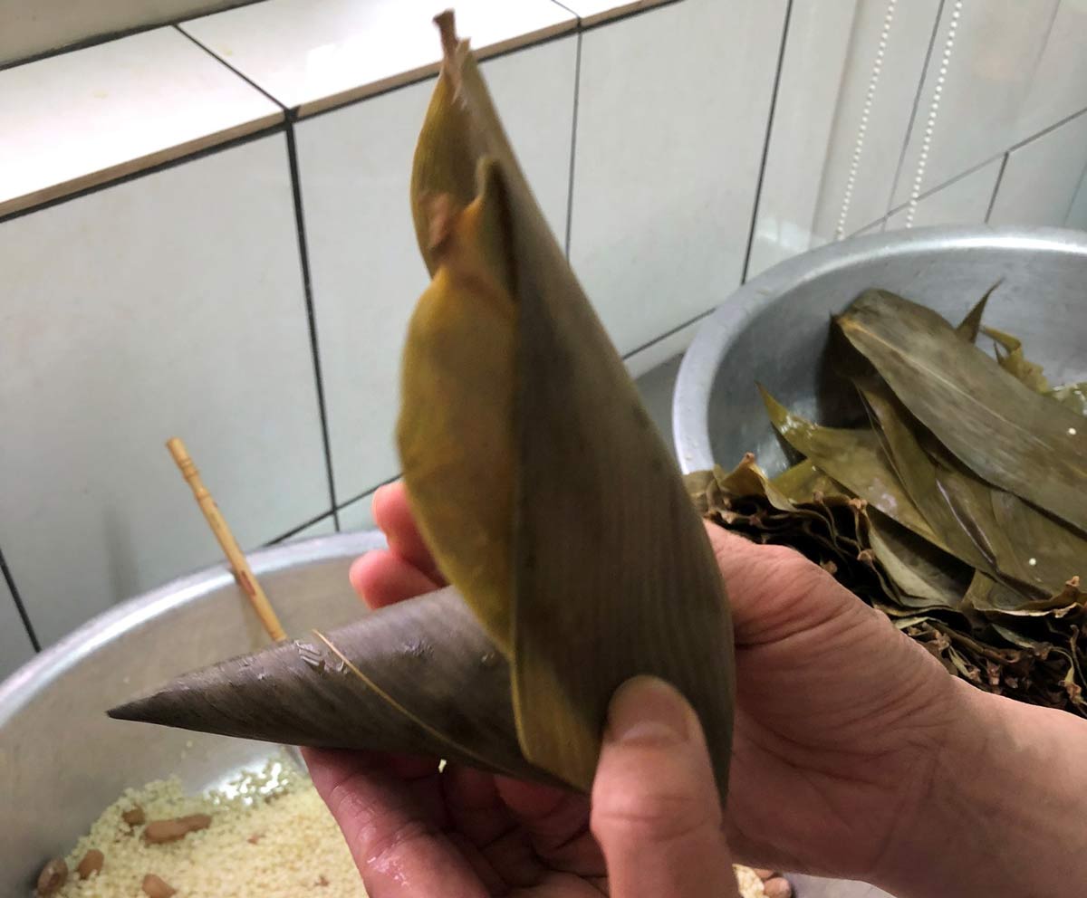 先在木門邊框上釘一個釘子,吊一條細繩,將兩片粽葉的頭對尾,尾對頭,再捲成圓筒狀,直立插入一隻筷子,然後舀米入粽葉筒裡,拿起筷子上下快速抽動,希望米粒可以更緊實,用雙手的拇指向下壓褶粽葉,再向左邊對折,剪去多餘的葉子;最不簡單是將包好的粽子綁上繩子,慣用手操縱的繩子,另一隻手拿的粽子,綁上繩子時,盡力使每顆粽子有完美的腰身;為了呈現一顆顆、一串串的無暇造型,便使力的拉粽繩,每一年依媽的右手尾指的第二節,總是被粽繩拉出了皮破出血,如此正襟危坐的粽子一串十顆,在滾鍋中從不破葉及脫線,這也是她堅持的人生,到現在過生活仍一刻也不鬆懈,輕鬆自在離得好遠,為此,我總不捨。