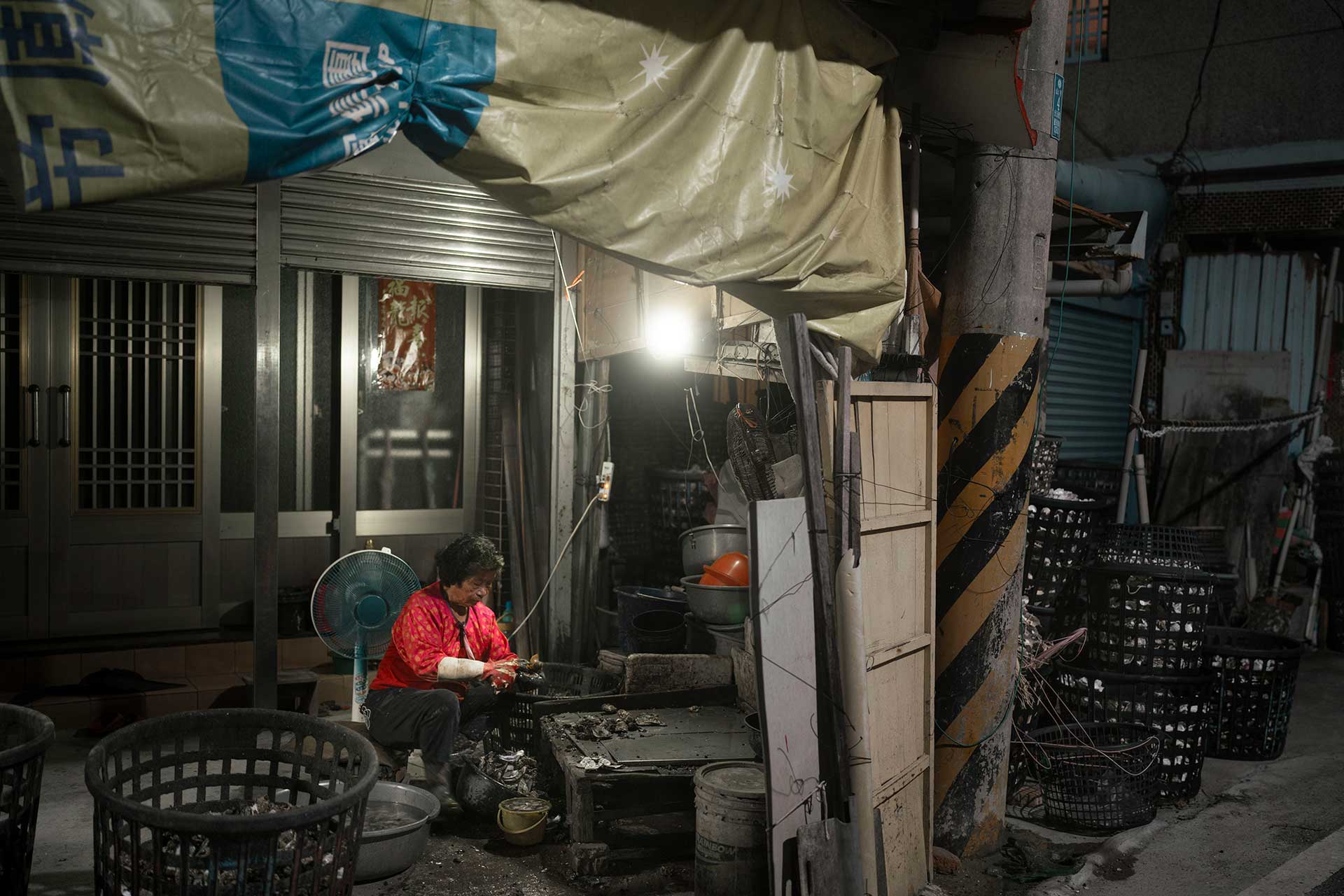 採收牡蠣是個體力活,蚵農在湧浪中行走於蚵棚上,平衡感驚人。他們以利刃割斷蚵索、順勢拉起蚵串,再將長長的蚵串盤旋置入簍中、將蚵簍搬至漁船上。