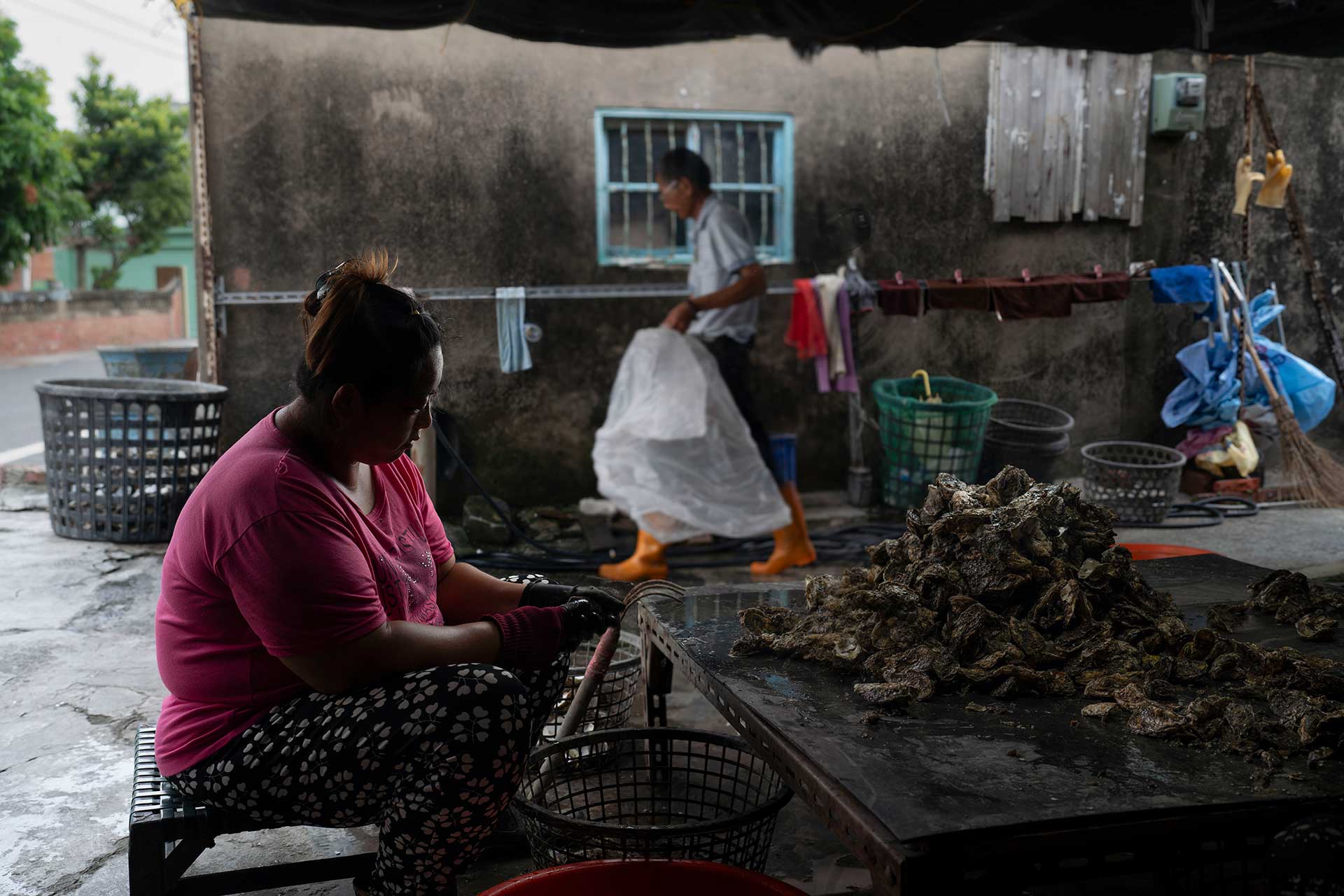 蚵村勤勞的人們不畏風浪,在海面顛簸的蚵棚上從事粗重的體力活。岸上的剖蚵大隊則握著粗礪的蚵殼,一粒粒撬開取肉,每一粒牡蠣都得之不易。